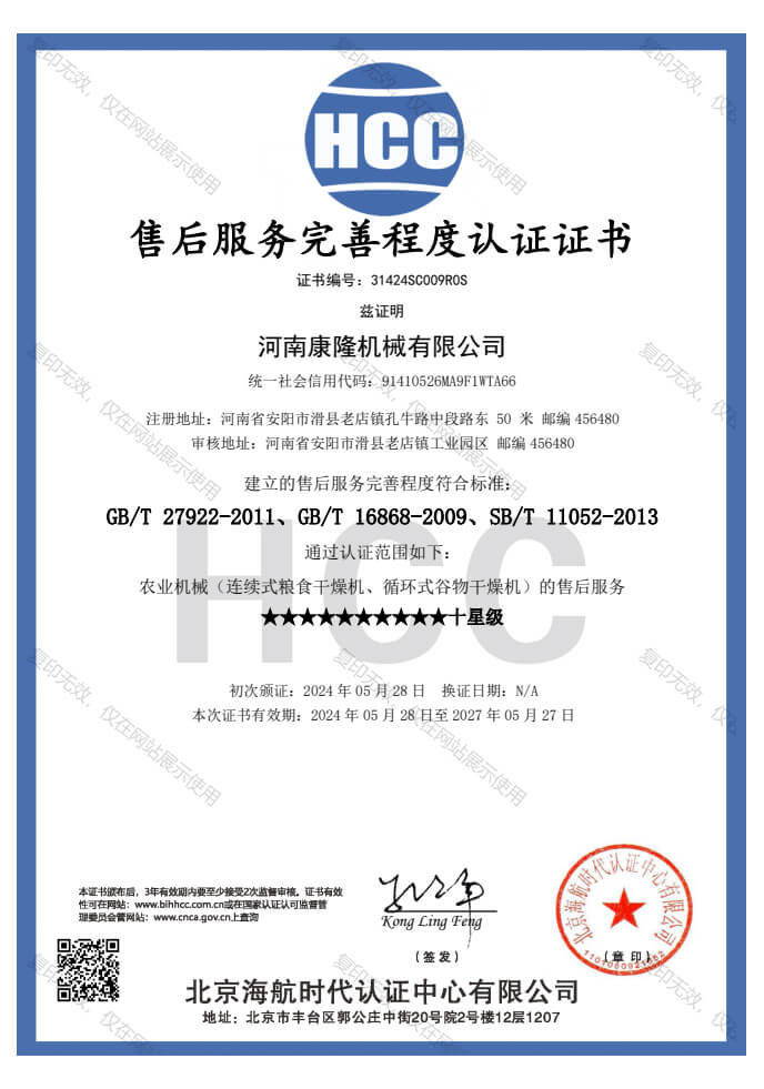 HCC售后服务完善程度认证证书
