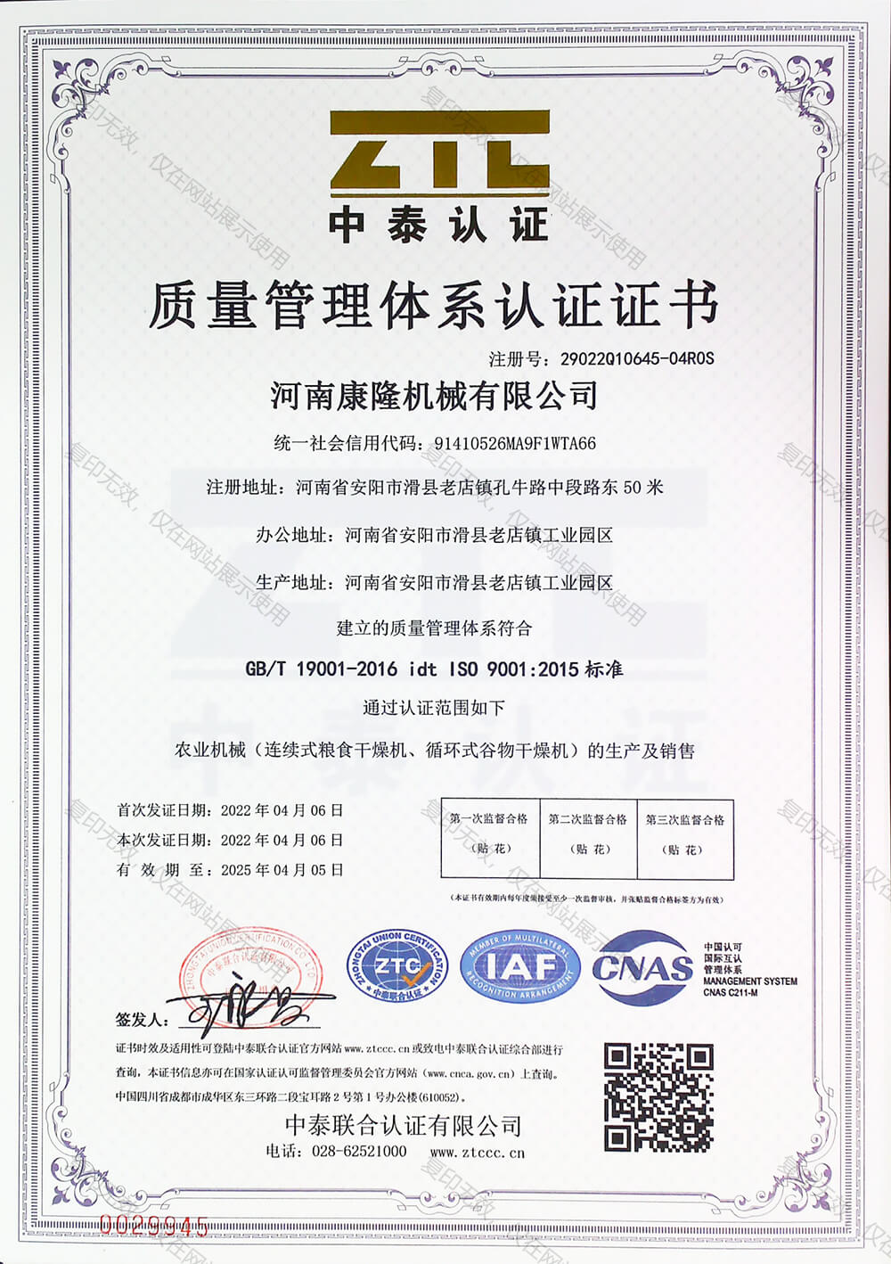 质量管理体系认证证书