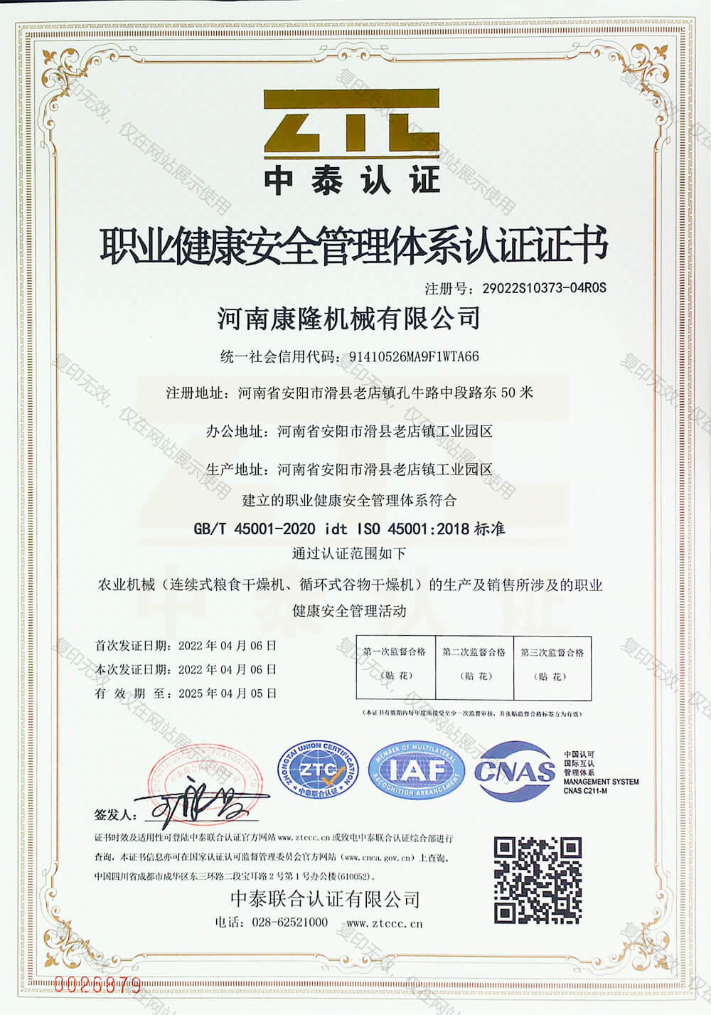 职业健康安全管理体系认证证书