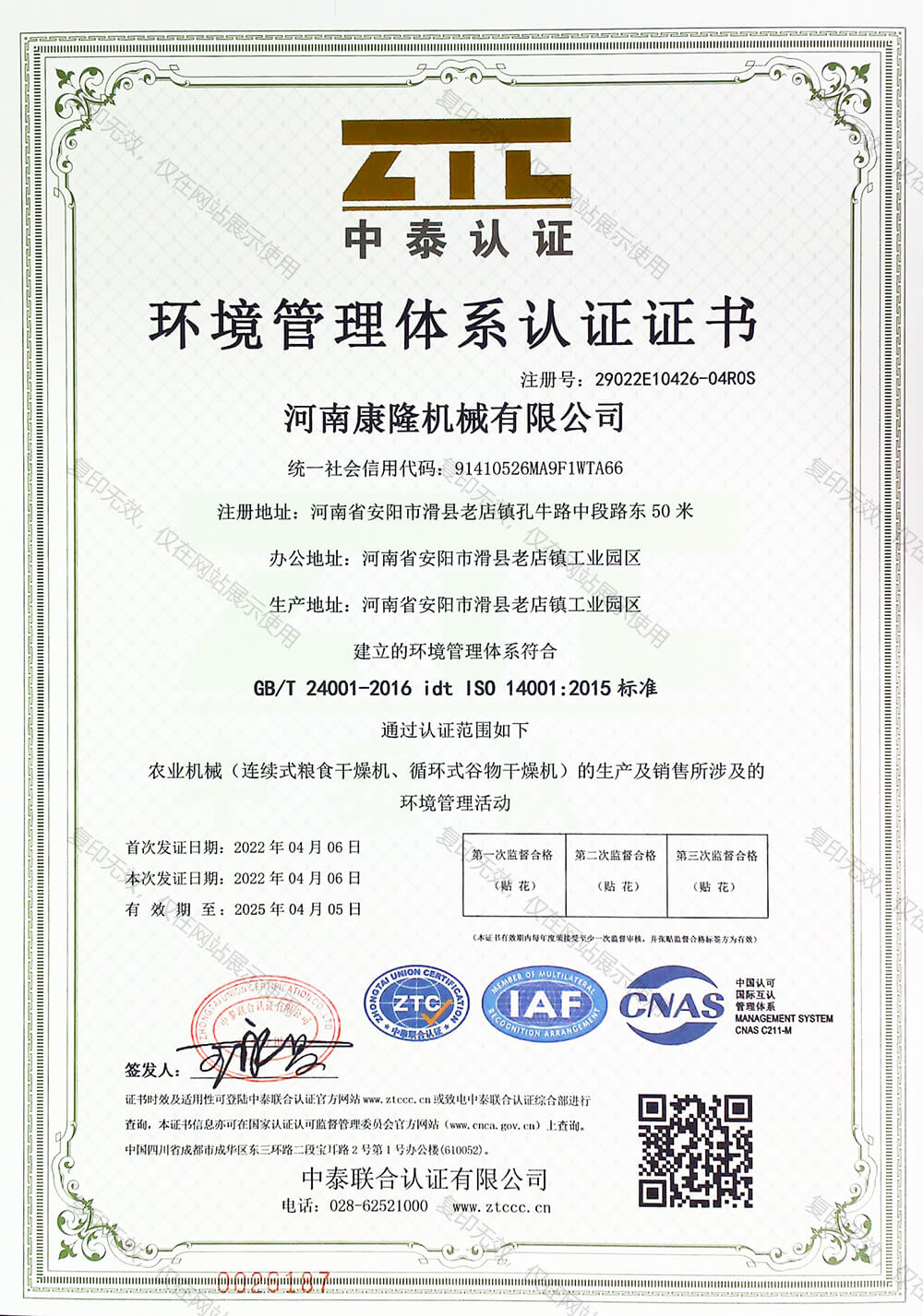 环境管理体系认证证书
